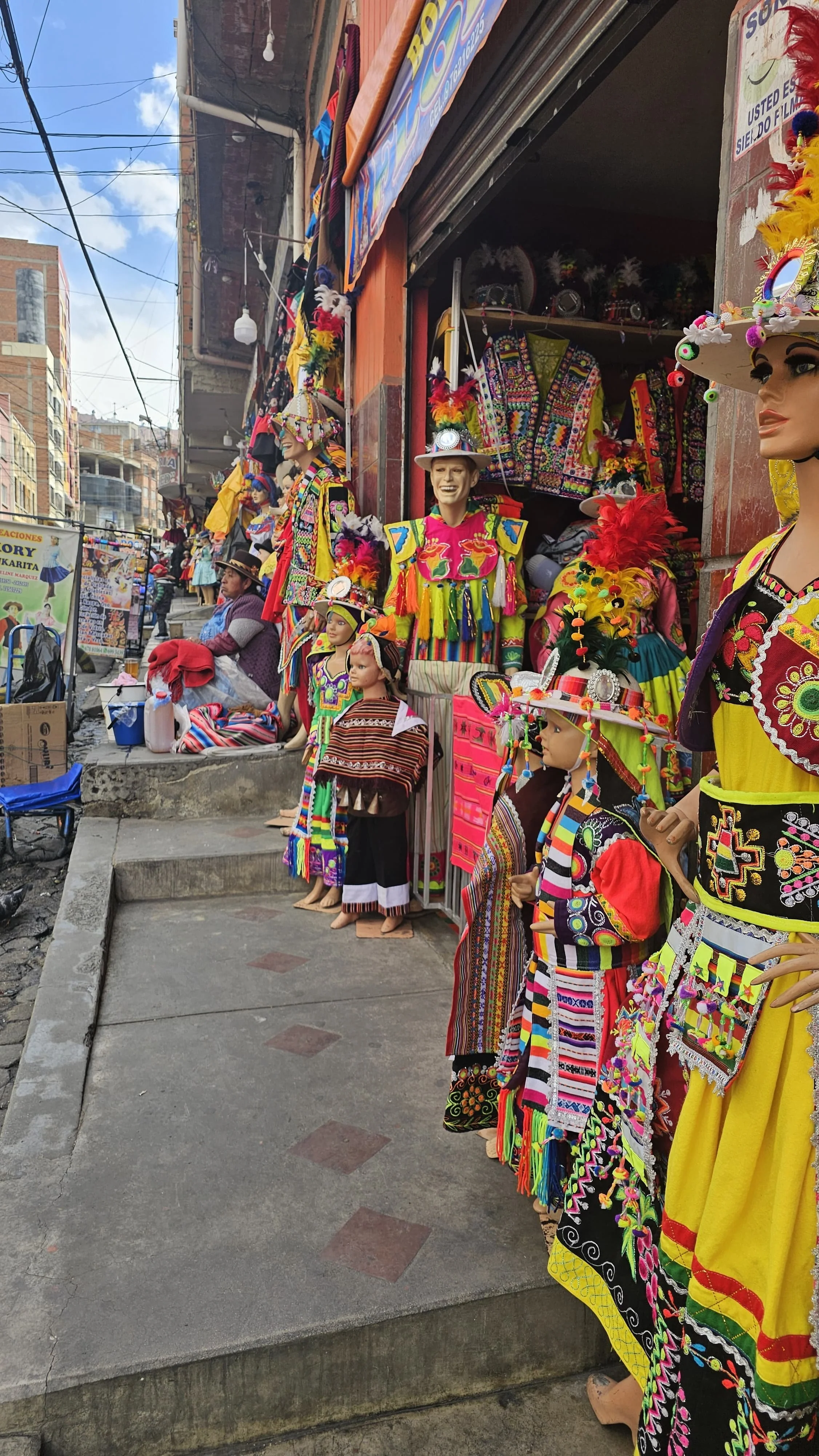 But look a little closer, and La Paz is full of color. You’ll see it in the rainbow of markets, from purple corn to yellow potatoes. You’ll find it in the murals splashed across walls and staircases, turning entire neighborhoods into open-air galleries. And you’ll notice it in the clothes of the cholitas, in their bright skirts and shawls that bring color to every street.